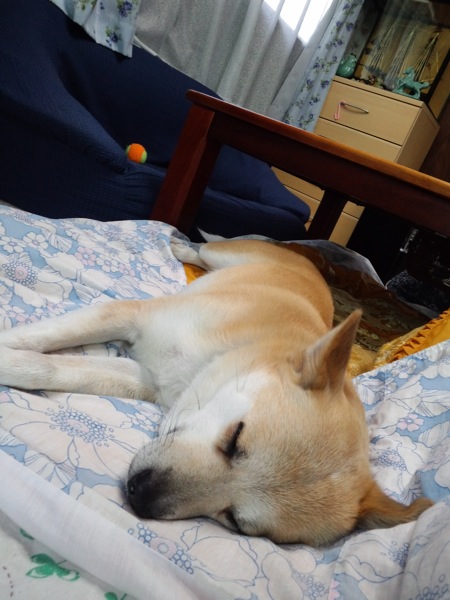 今朝も散歩から帰ってジャーキーを食べて、TVで食を観るねえちゃんとおかあちゃんの前で寝とりました。