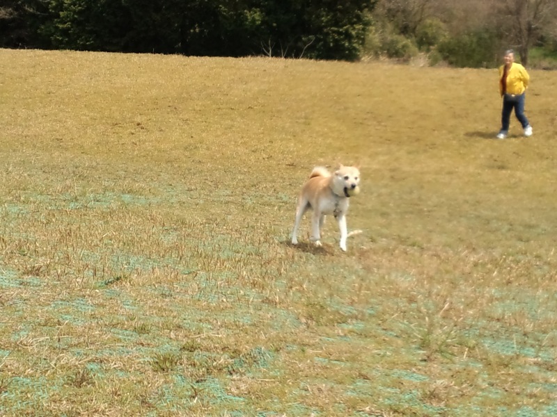 案の定、駐車場にはちらほら車は停まってたけど、公園には人影なし。リード外してやったら、ドドドドドーッと走って行きました。(^ ^)