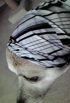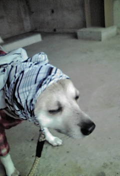 夕方の散歩で雨に降られて雨宿りしてる時に、身につけてたスカーフを頭から被せたら大人しくしてたんで、ほっかむらせたと。