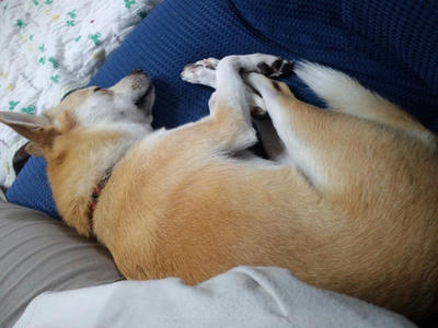 これは、ねえちゃんの布団に自力で潜ろうとしたが潜れず、諦めて上で寝たの図。