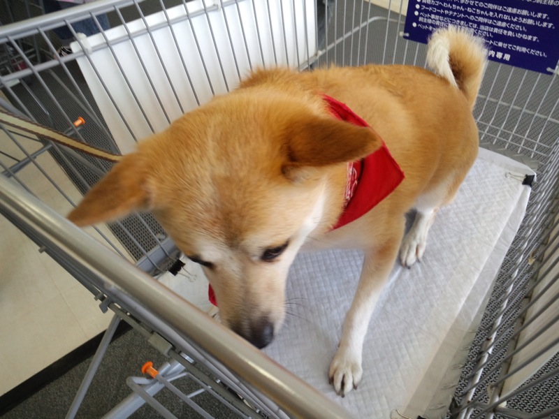 なので、入れるとこには入れちゃおう!と言うことで、ミスマの『わんちゃんねこちゃん専用カート』に乗せちゃいました!