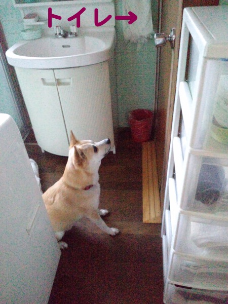 どこで吠えてんだ、と思って見に行ったら、トイレの前でドアを開けろと訴えてました。プー!(*≧m≦)=3