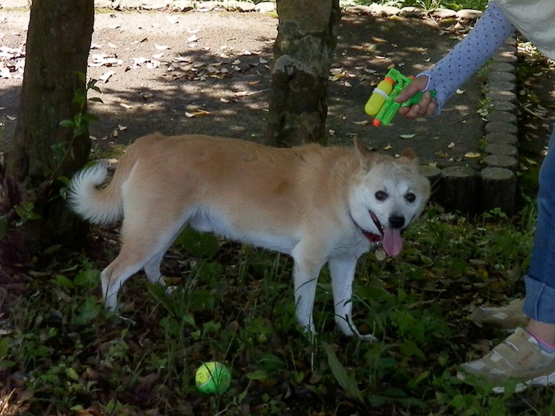 水鉄砲でクールダウン&湿った落ち葉の上でごろりんごろりんした後はまた走る、を、かなり繰り返してたっぷり遊んできました。