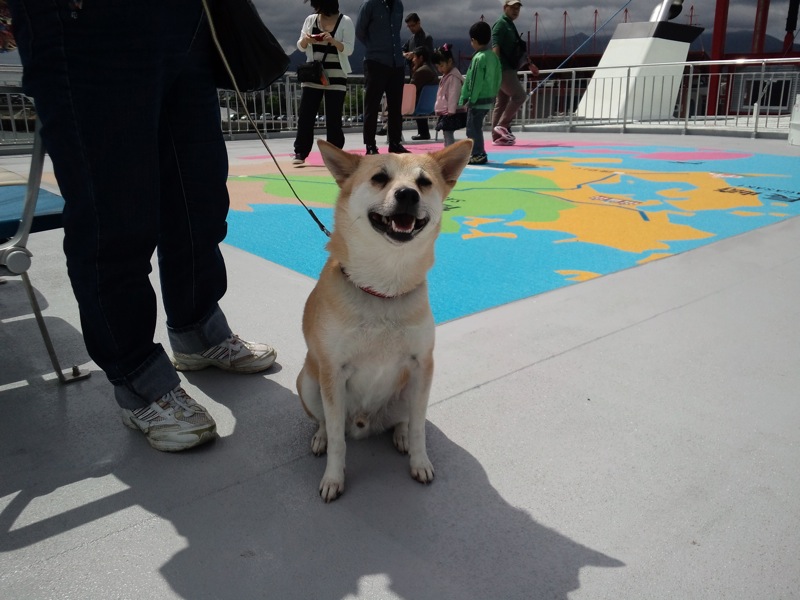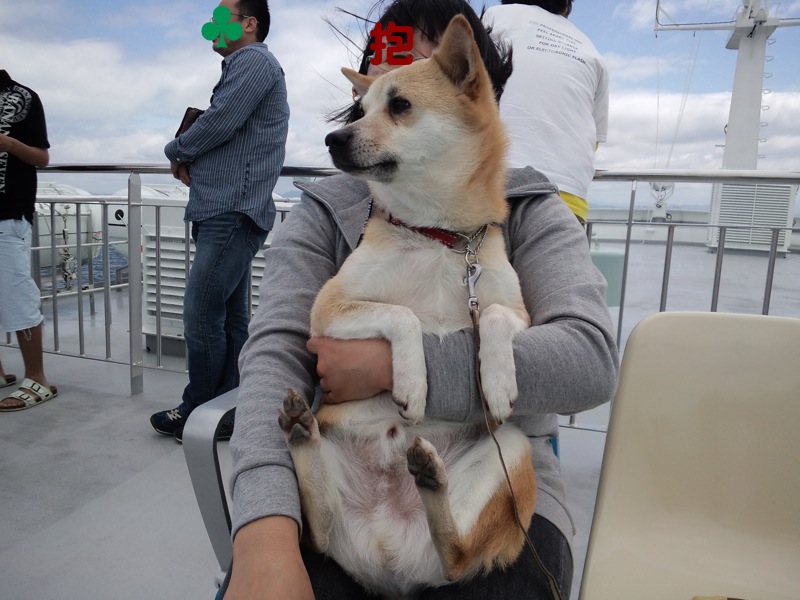 初めてのフェリーでどうかと思ったんだけど、大丈夫そう。わんこ好きのお姉さんやおじさんに撫でてもらったり。