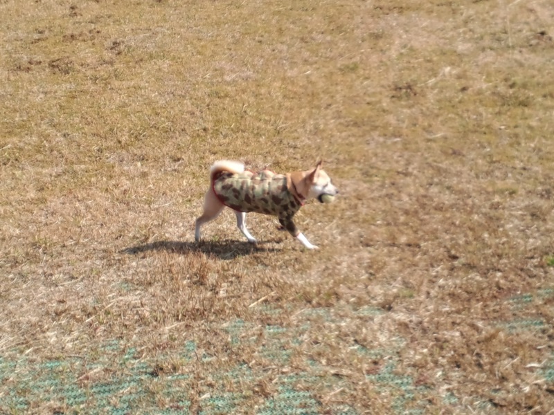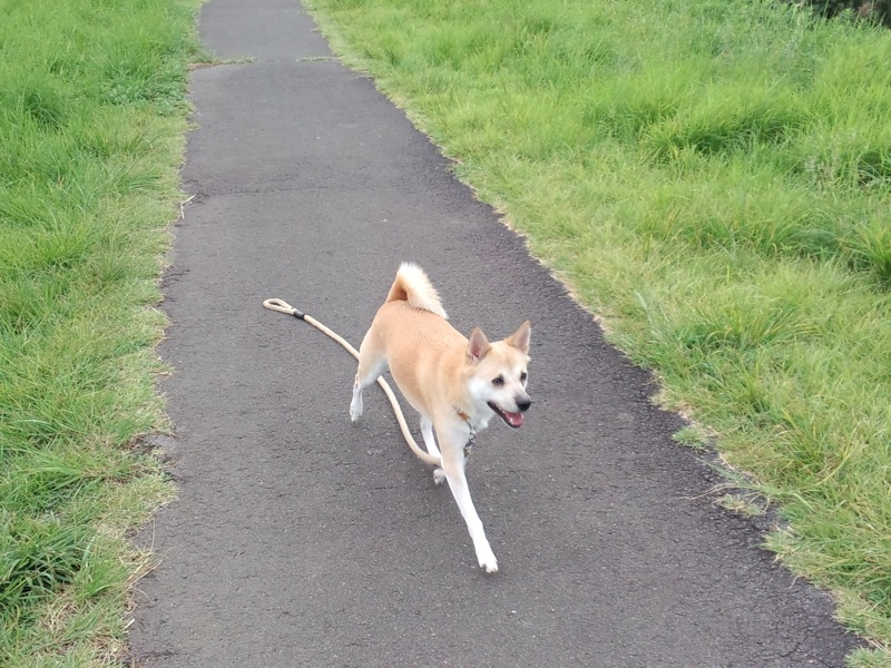 広場のひとつで会った、白いミックスの女の子と挨拶したら意気投合したらしく、「遊ぼー!遊ぼー!」で、お互いぴょんぴょん弾んで走ってでしたが、向こうのお父さんがかなり振り回されてたので、少しだけ遊んでバイバイ。