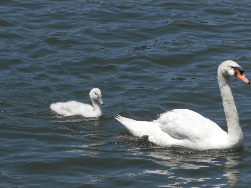 ダムには白鳥の親子もいました♪雛が一生懸命親の後をついて泳いでて可愛かったv