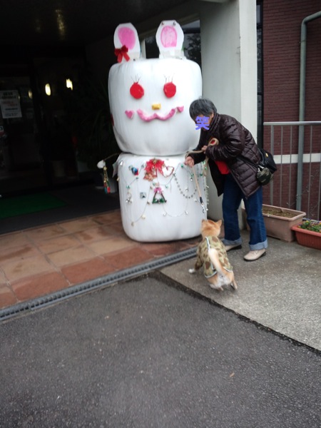 茂みの中からにゃおにゃお言ってるのを、ろろたが「どこだどこだ」と探すので、面白がって鳴き真似してたら、突進してきて飛びつかれました。(笑)