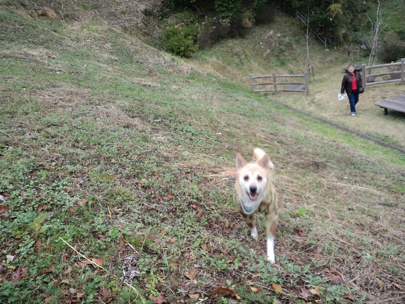ここはハタ揚げ大会があるところで、その名もハタ揚げ広場と言う、広い芝生広場があるんですが、今日はカップルがキャッチボールしてるし、親子連れも多いので、ロングリードがないとここでは遊ばせられない。