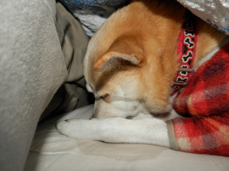 ねえちゃんがちっちくちっちく仕上げをしてる間、ぼっちゃんはねえちゃんのベッドに埋もれたり、コタツ敷きに伸びたり、兄ィんとこ行ったり。今日はえらい良く寝てました。