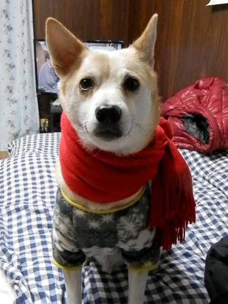 マフラー巻いてやったら、温かくて気に入ったらしいです。(^ ^;)