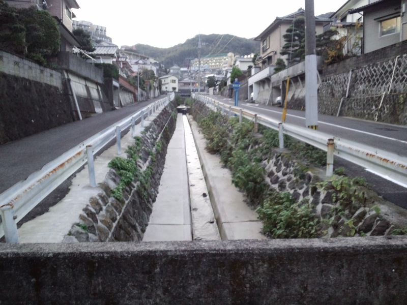 散歩コースにこういう、川って言うか下水道?を挟んで両側に道路のあるところを通るんですけど、ろろたのう●こを取ってたら、後ろからライトが射して。