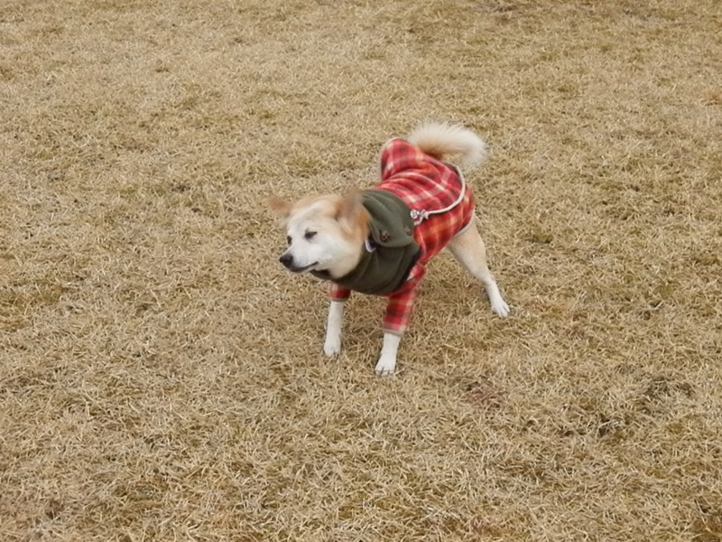 車から下りるなりおかあちゃんがトイレに行ってしまった所為か、芝生広場に入ってすぐの辺りでお弁当食べてるご夫婦がいらしてリードに繋がれたままだったからなのか。