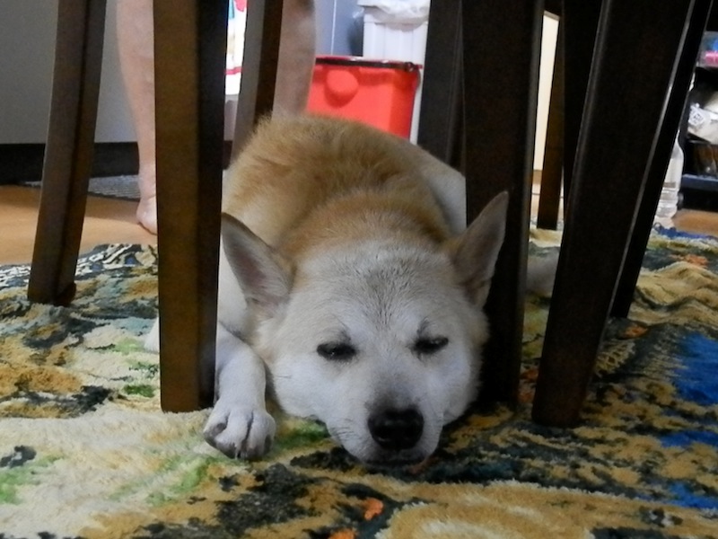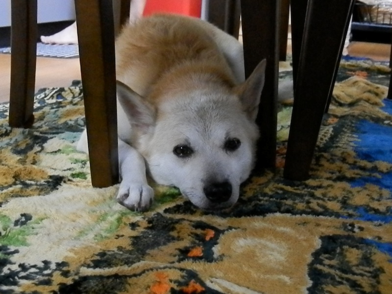 ずっと抱っこしてやってる訳にもいかないのが解ったのかどうかは解りませんが、その内、ゴロゴロさんの時の定位置、テーブルの下に潜っておりました。