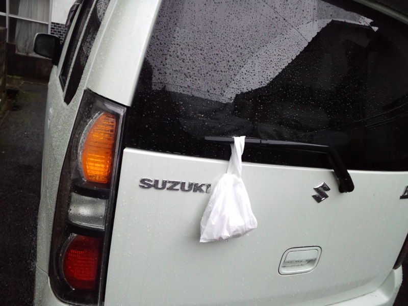 ところで、高架下に連れてった時や、どこかに遊びに連れてった時、う●こ袋はリアワイパーに引っかけて帰ってます。