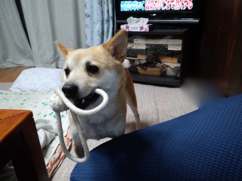 このところ紐のおもちゃを次々にブチブチ喰い千切って、ボロボロになってしまったのでそれらは捨てて、おかあちゃんに新しいおもちゃを買ってもらいました♪