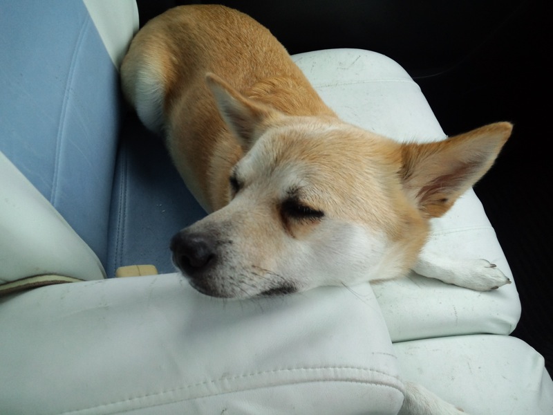 今朝も散歩から帰ってジャーキーを食べて、TVで食を観るねえちゃんとおかあちゃんの前で寝とりました。