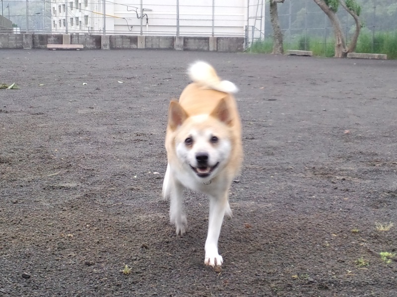 その後も、おかあちゃんが面白がって何度も「とっと!」言っては追っかけさせてたんですけど、カラスは反撃してくるし、その辺でやめとけ言ってろろたを呼び戻してたら、走って来るろろたの後ろから迫る、1羽のカラス…。