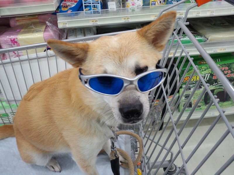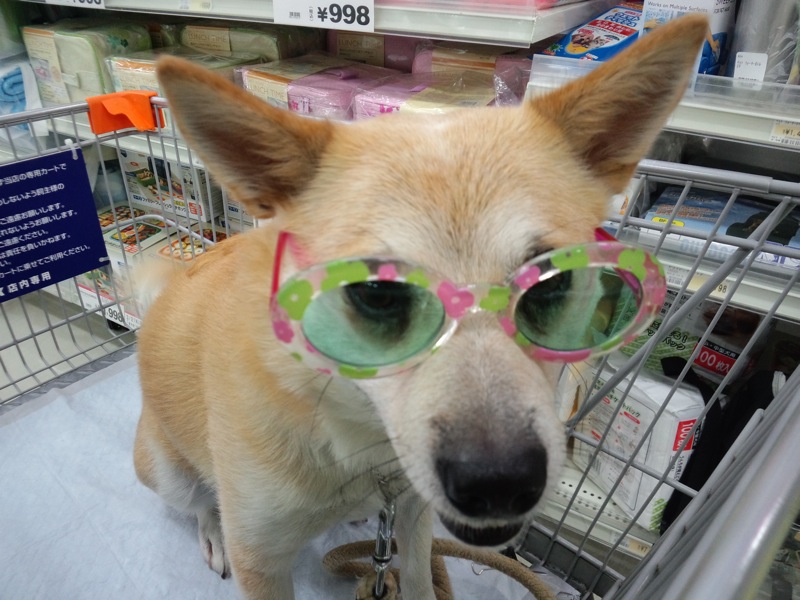 レジャー特集的なコーナーにわんこのおでかけグッズもあったんで見てたら、子供用のサングラスを発見。