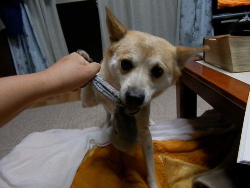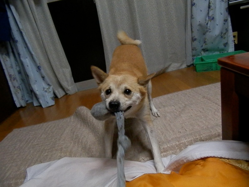 穴の空いたねえちゃんの靴下を投げたり引っ張りっこしたり。