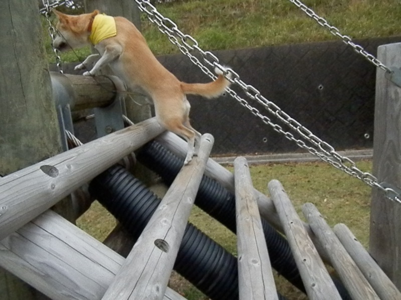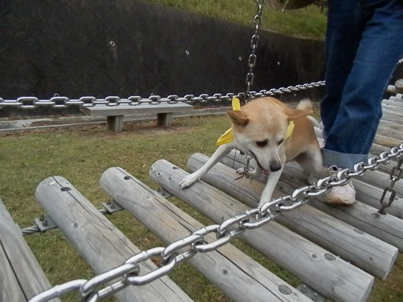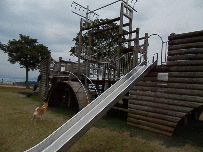 ディスクドッグ大会を見に行く前、アスレチック広場で遊んで行きました。この時ちょうど、人がいなかったんで。