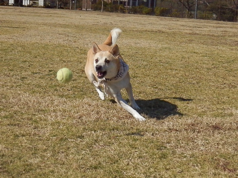 疲れたのか木陰に行ってごろんごろんし始めたから、もういいかなと思ってボールを拾えば、また投げるのを待ち構えてるし。