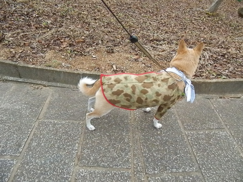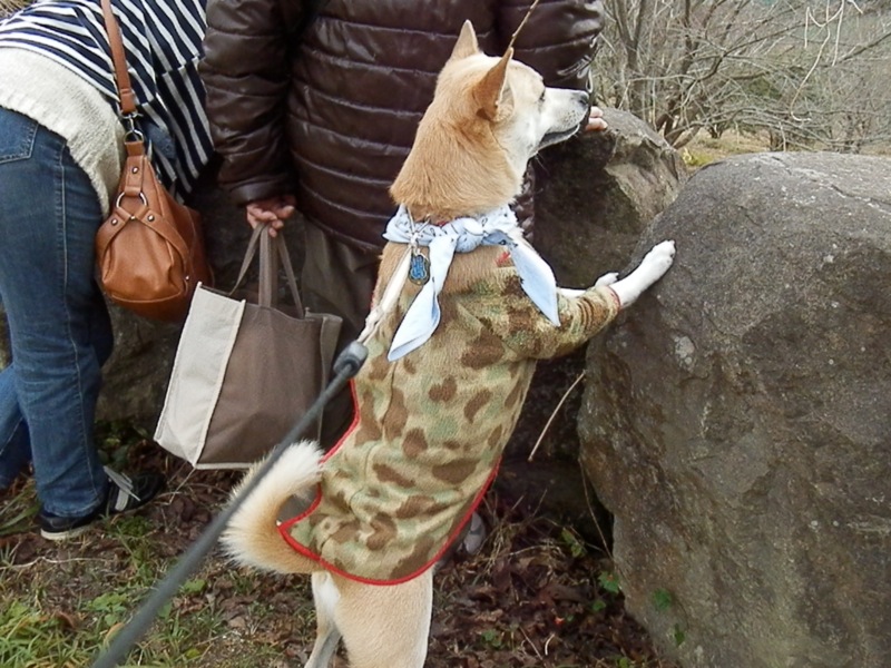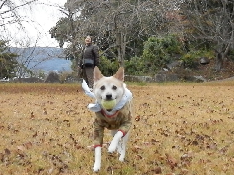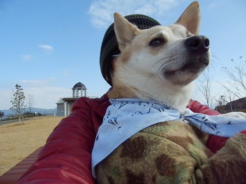 で、青空の下、広い広場でねえちゃんに抱っこされて固まるわんが1匹…。