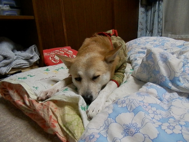 おかあちゃん曰く、おかあちゃんが起きる10分くらい前(つまり、ねえちゃんが下りて来る30分くらい前)に布団に潜り込んだらしいですが、あんたの散歩の為に、寒いのと眠いの堪えて起きてきてんだから、起きろ。