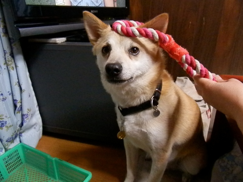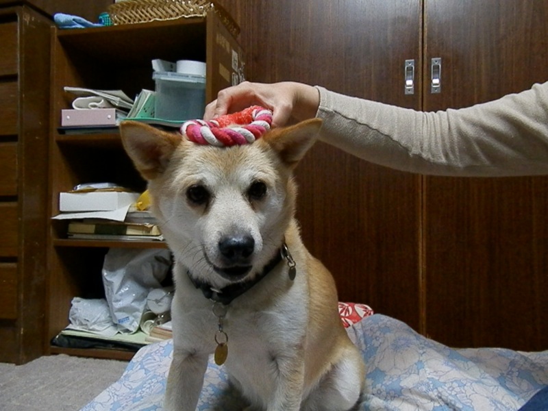 玩具を頭に乗せたら、捩り鉢巻き風でイイ感じ♪(・ω・)bグッ