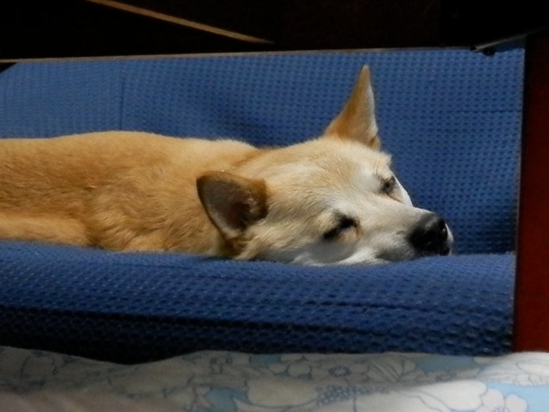 湿布を貼った腕で、腕枕をして寝る犬・ろろた。