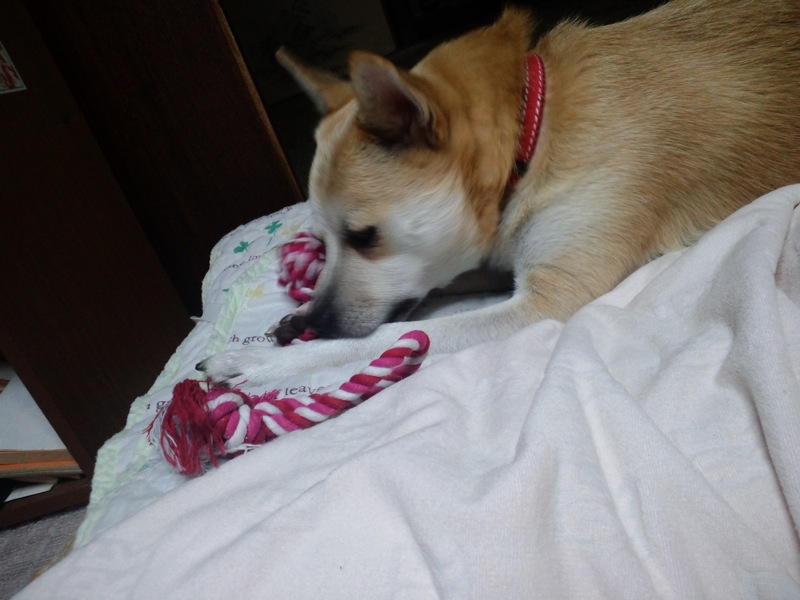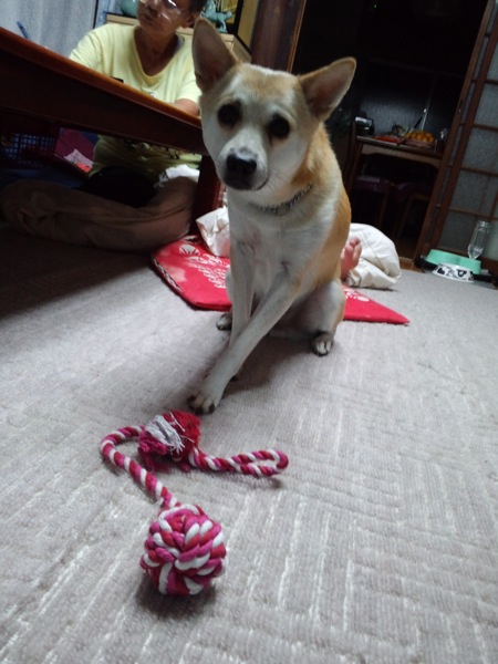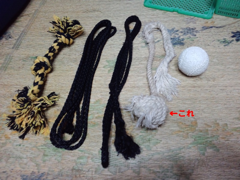 右から2つめの紐のボール。かじかじブチブチ引き千切ってくれてボロボロになってしまったんで、昨日、おかあちゃんが新しいのを買ってくれました。