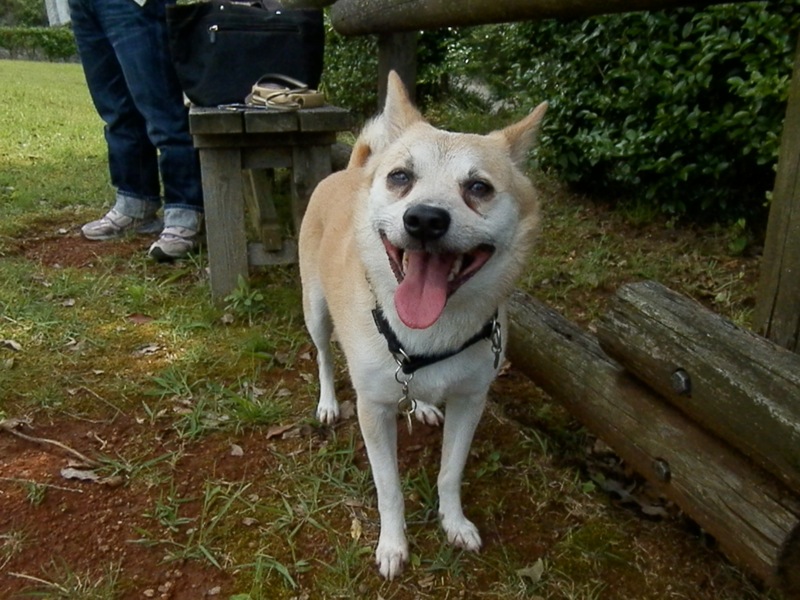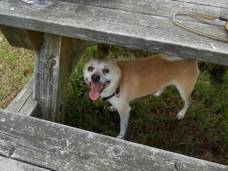今日は東屋に人がいたんで離れたとこで遊んでたんですが、テーブルの下に潜り込んで休憩してました。(^ ^)