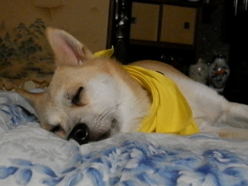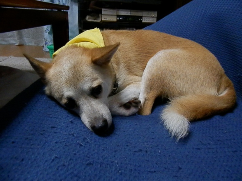 日中、暑いのに外に出たがったって話だし、夕方の散歩も、曇って来たから大丈夫かと思って出たら暑かったってことだし、暑気中りかなぁ。