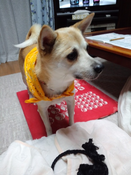 今日もオモチャをカジカジするのに夢中になってるとこにバンダナ被せたら、小さく「ヴヴヴ…」言ってました。
