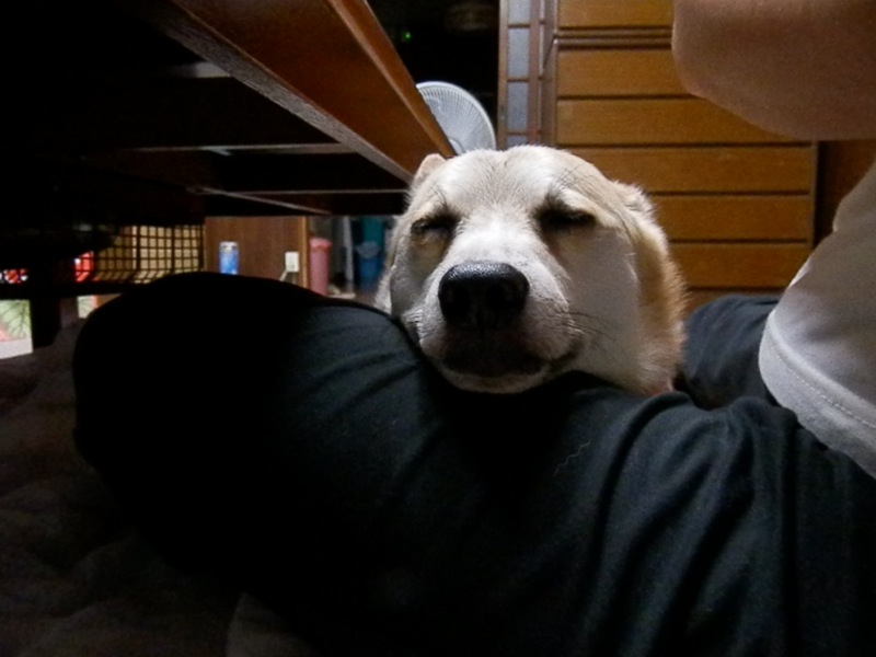 精霊船が行ってしまった後、家の前のとこでご近所のお孫ちゃんたちが花火してる音にすら、震えてはいないものの縮こまってたので股の間に収めてたら、その内 ↑ こんなでした…。
