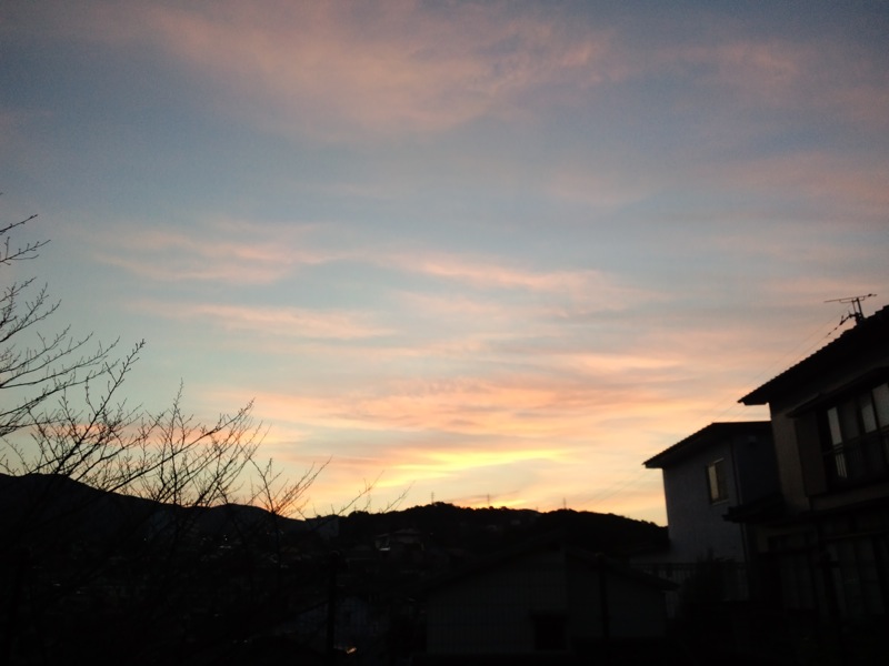 公園のいつもの場所まで階段を上って、ろろたが匂いを嗅いで歩いてる間、ベンチに腰を下ろして休憩してたら、朝焼けが綺麗。