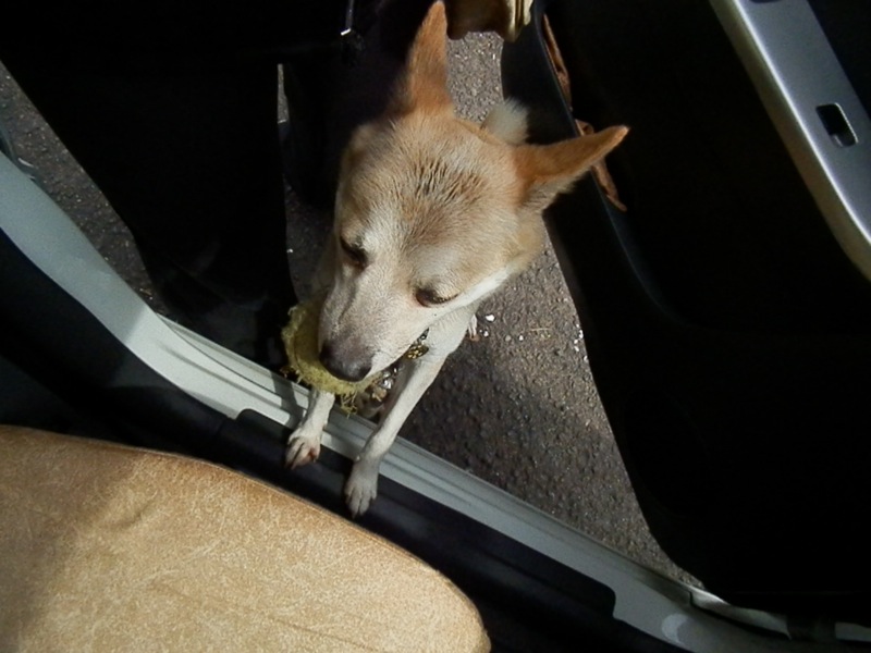 まだ遊びたい時は、近づくとボールを置いて蹴られるのを待って構えるんですが、満足すると今度は、ボールを咥えたまんまうろうろしだして。