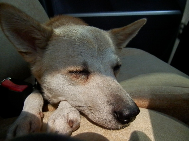 早く車に避難したい一心で、吊り橋さえ何の躊躇もなく渡ったおぼっちゃま。ビビリ疲れてぐったりなのでした〜。