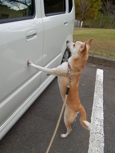 最初、ねえちゃんの手を擦り抜けて、ちょうど人を迎えに駐車場に入って来た車に ↑ こうやって「もう帰る〜!((o(;△;)o))」状態でしたよ。車乗ろうとしてた人がドア開けられなくて戸惑ってましたよホントすみません;