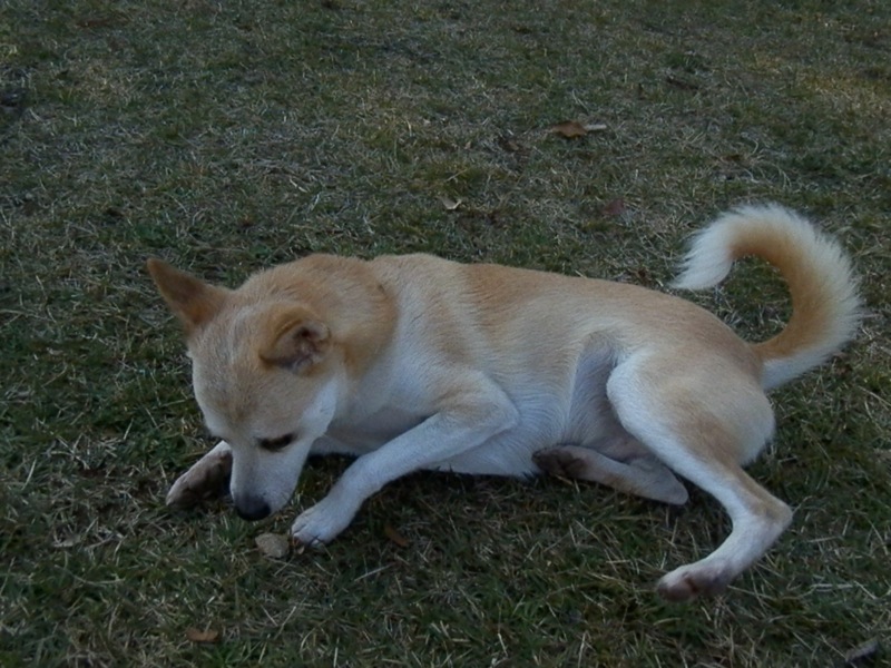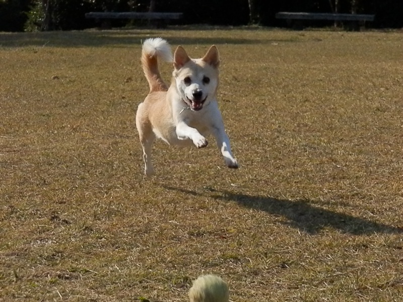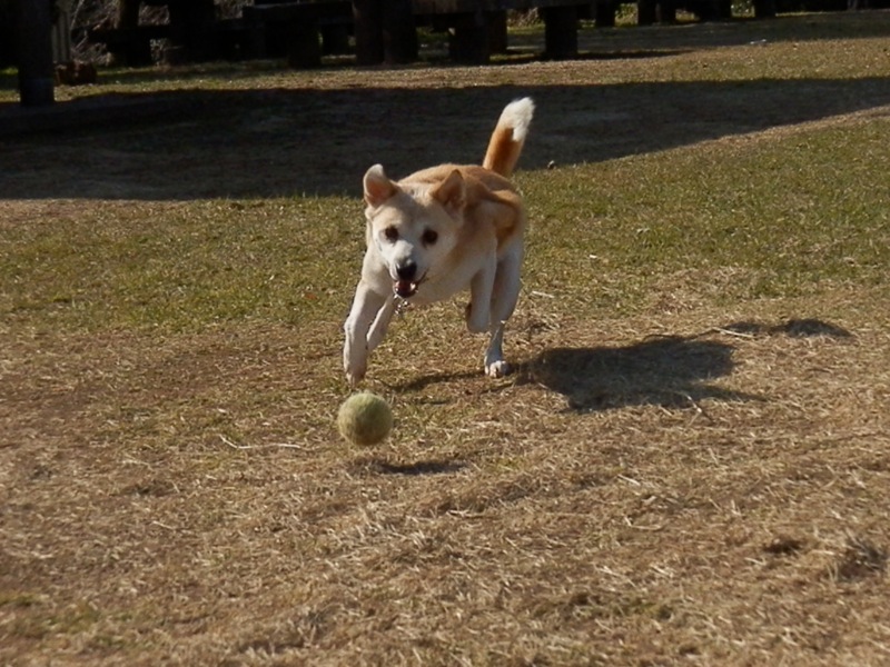 わーっと遊んで、ボールを渡さなくなるので「休憩しよっか」とか「お水飲もっか」とか言うと、とことこと水を飲みに行って、ごろんごろんして休憩&クールダウン。