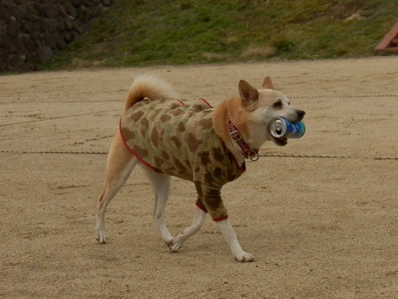 その後、単に走り回るのも飽きたかなって感じだったけど、もう結構走った後だし、今からボール出すのもね…ってことで、おかあちゃんがその辺にポイ捨ててあった空き缶を蹴る。