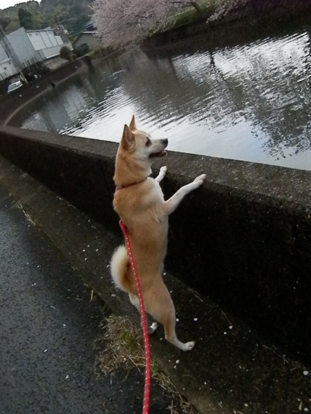 ぼっちゃんも川越しに桜を眺めます。