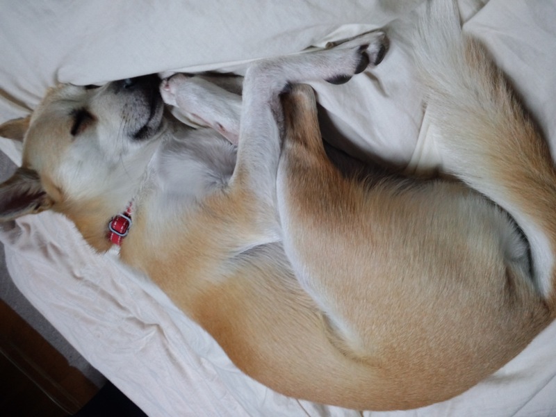 帰って来た時には大歓迎で大はしゃぎだったのに、寒かったのか眠かったのか、今日は私がご飯食べてる間に、ひとりで毛布に潜って寝てました…。