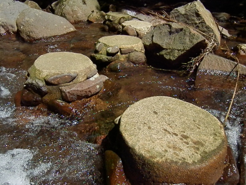 ここはご覧の通り、対岸に渡り易いように石が加工してあるんですが、最後のひとつと岸とがちょっと離れてる所為か、渡って行けるのに戻れないぼっちゃん…。