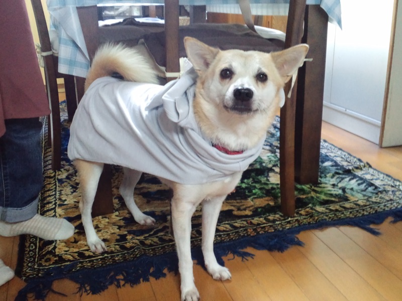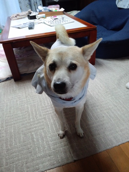 昨夜から今朝はまた冷え込みました。ろろたも寒かったらしく、夜中、布団に潜って来たそうで。 おかあちゃんの古い、捨てようかなと言っていたシャツを着せてもらいました。(^ ^)被せようとしたら嫌がってたんですけどね、いざ被せられたら暖かいのか、大人しくなった上に目がしょぼしょぼ。ネムイ(´・ωゞ) あったかいねー。よかったねー♪新しいお洋服できるまで、それで過ごしなさいね。にほんブログ村よろしければポチッとお願いします。m(_ _)m